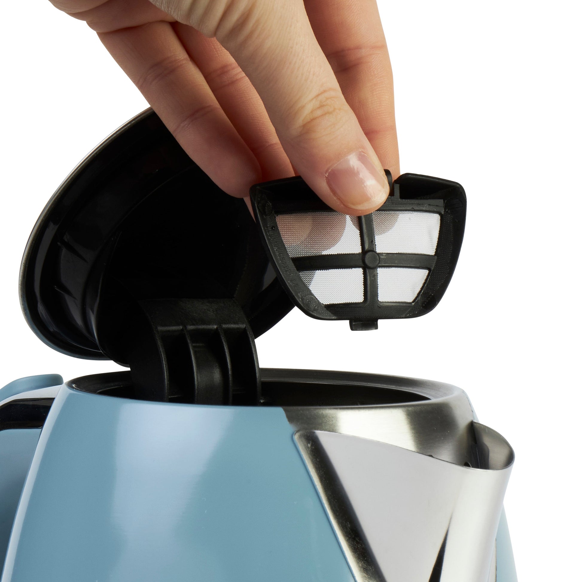 Dreamy kitchen appliances inspired by quintessential seaside towns in England: Haden’s Brighton Collection is influenced by smooth pebble beaches, deep-sea hues, and a modern nautical theme. The Brighton Kettle brings elegant style to any kitchen with its Sky Blue finish and stylish chrome accents. This cordless electric kettle features a 1.7-liter capacity, a convenient water viewing window, a light indicator during boiling, and an automatic shut-off feature for added safety. Spare water filter Included. Complete your countertop with a matching toaster and coffeemaker, sold separately.