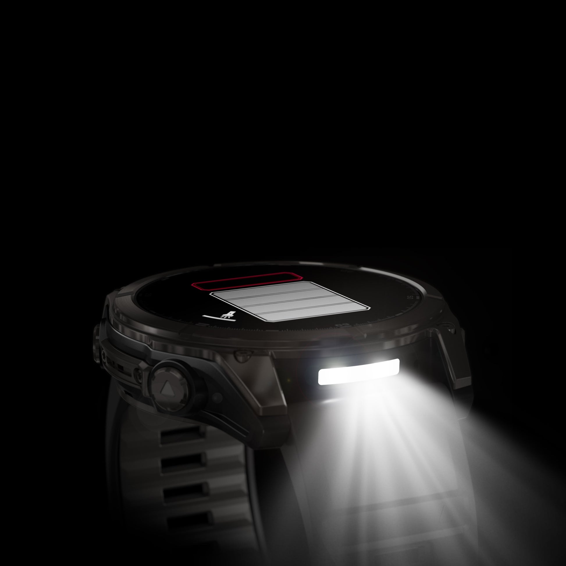 Bright 1.4” AMOLED display with scratch-resistant sapphire lens, durable titanium bezel and a built-in LED flashlight for after- dark visibility